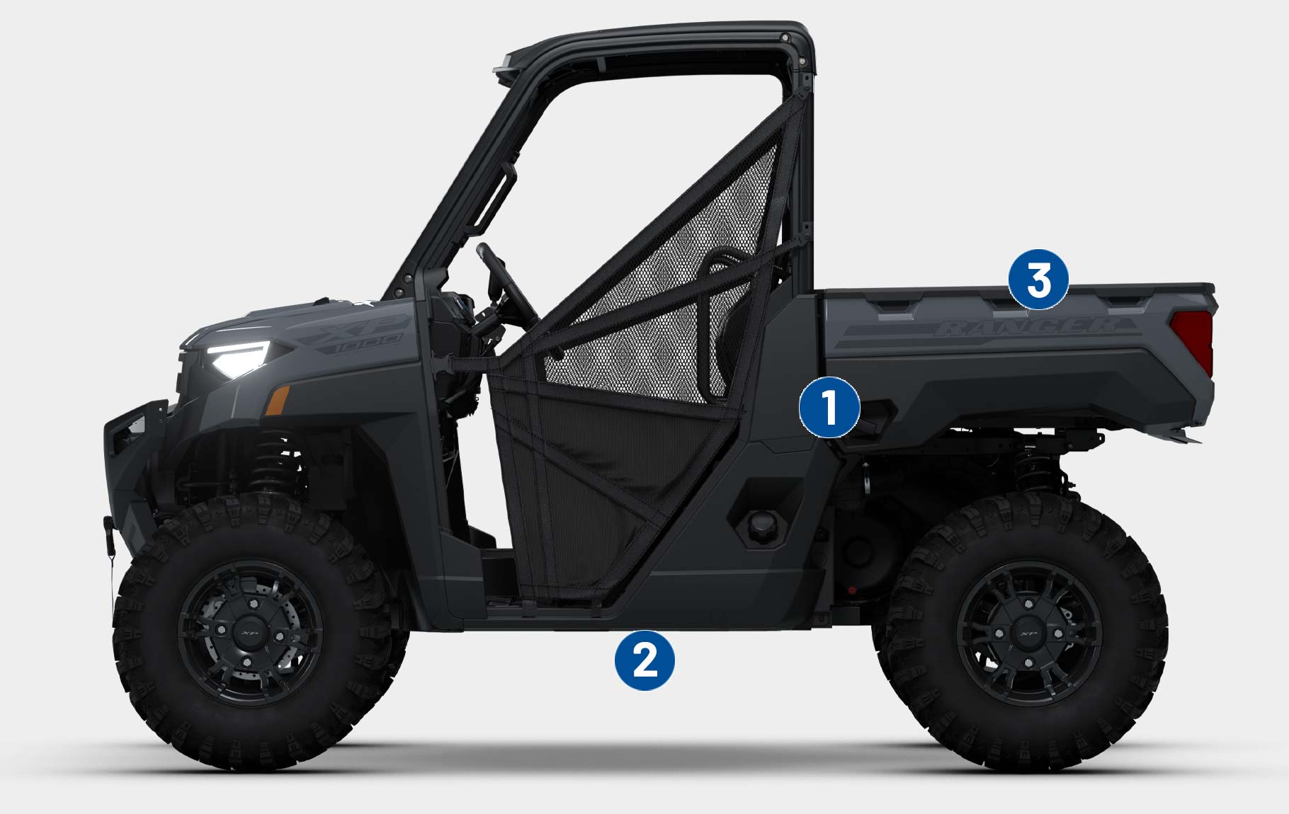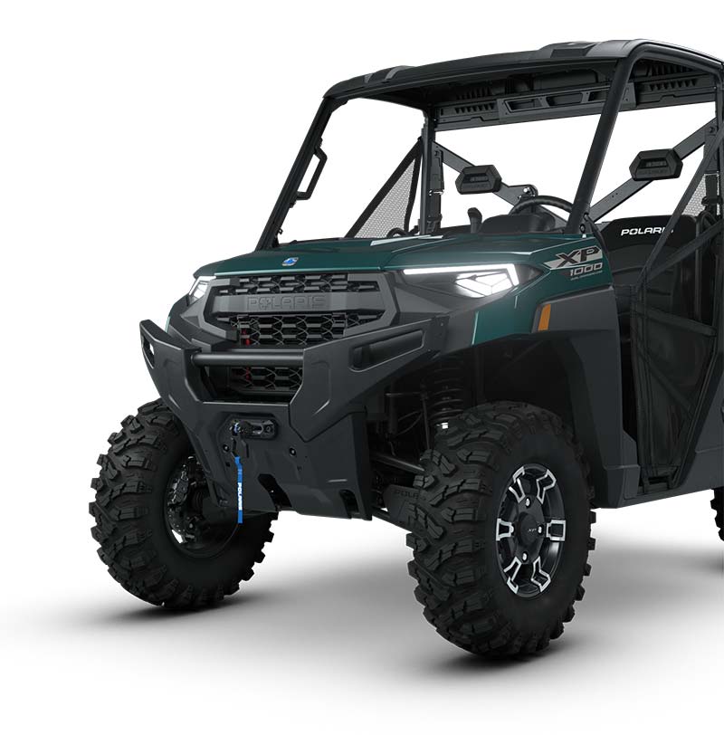 - 660-W charging system, Polaris Pulse electrical system (3-position), 12V accessory outlet, battery trickle-charging port, 2,040 kg Winch with synthetic rope, Auto Stop and wireless remote, Large steel bumper, full-coverage skid plate, A-arm guards, Cab nets